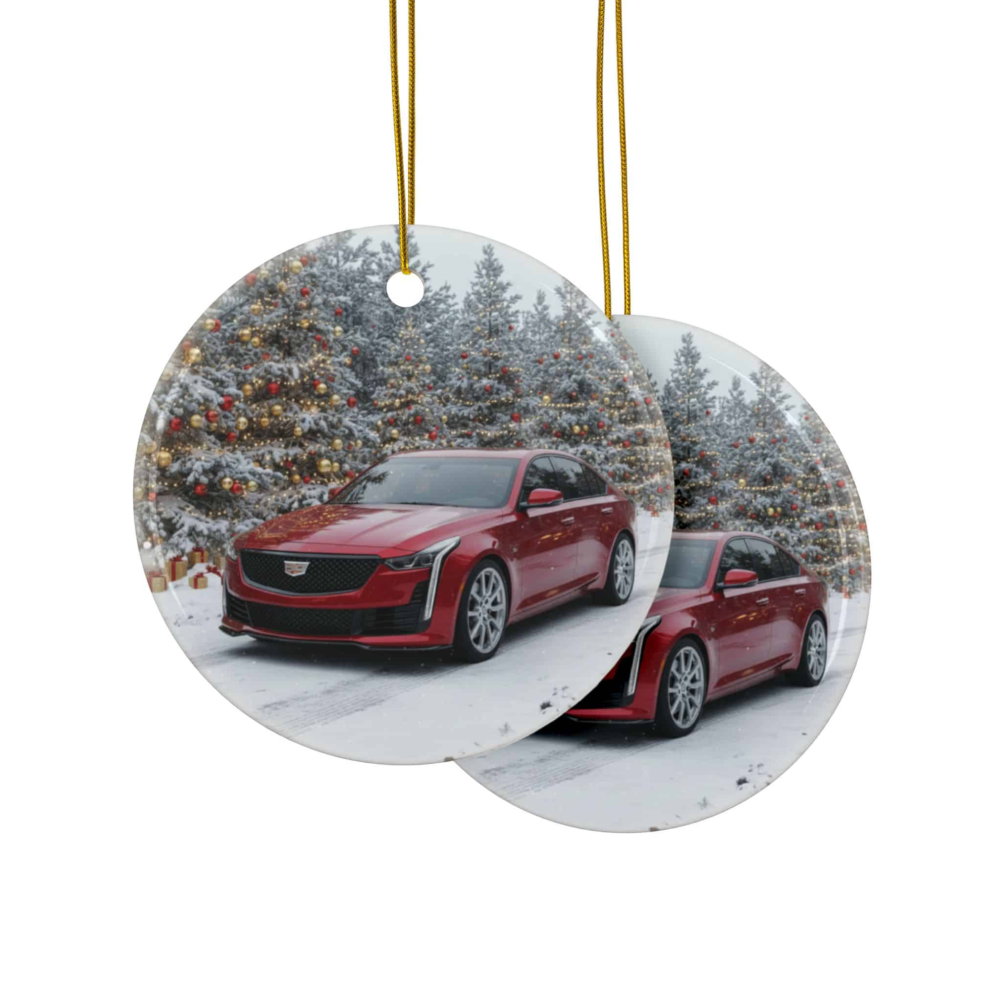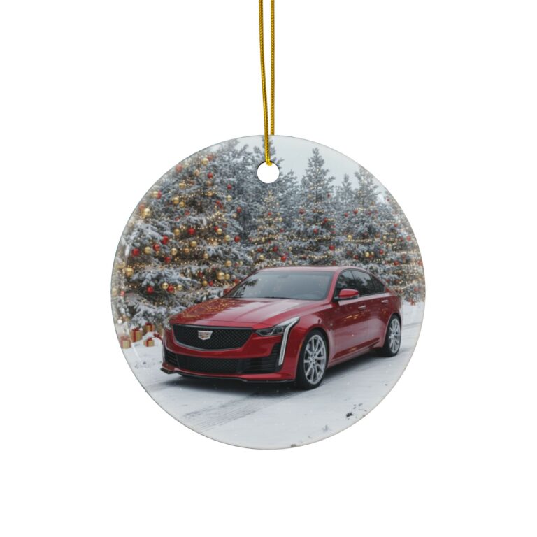Crafted from premium ceramic, this round ornament features a double-sided, full-color print with vibrant detail and a glossy finish that reflects beautifully under Christmas lights. It comes with a gold hanging cord for easy display on your tree, in your garage, or anywhere you want to show off your Cadillac pride.