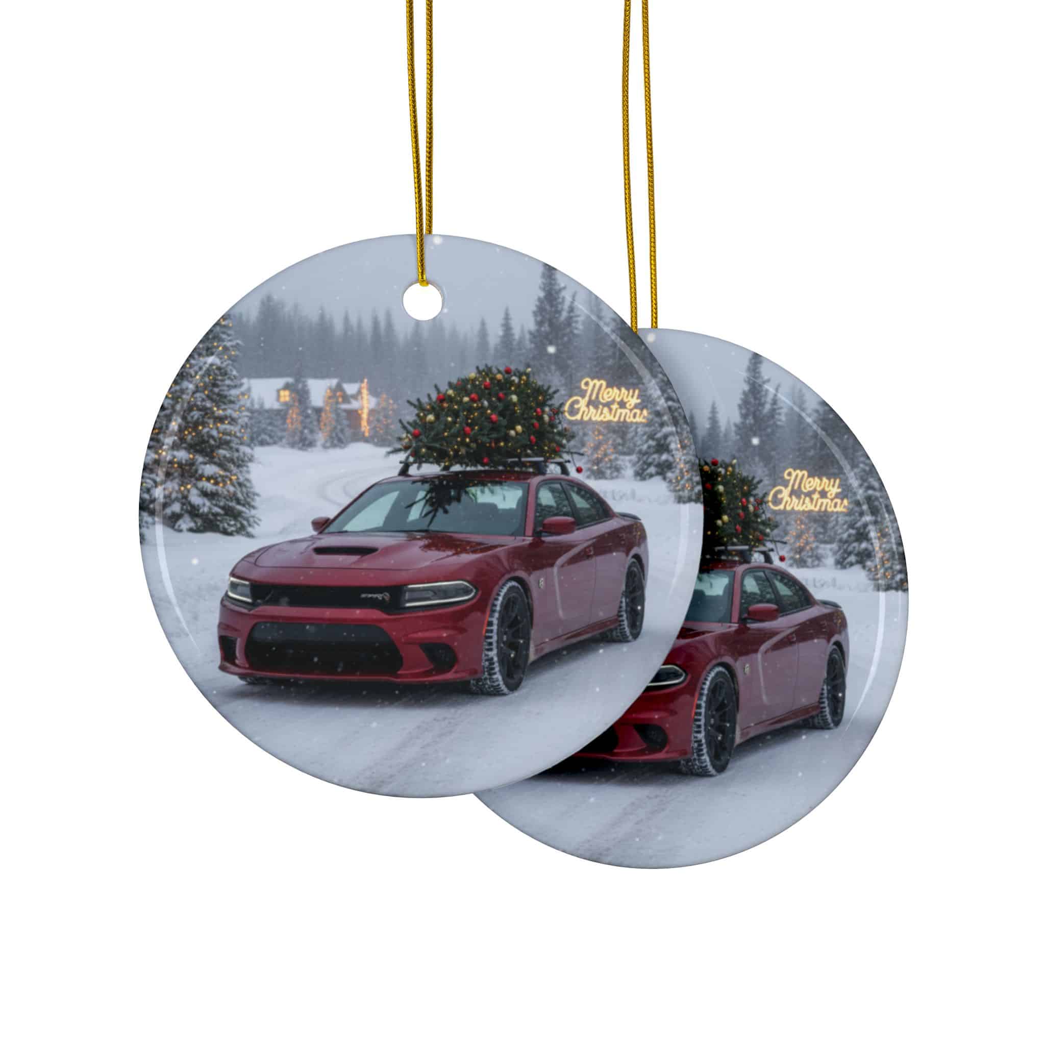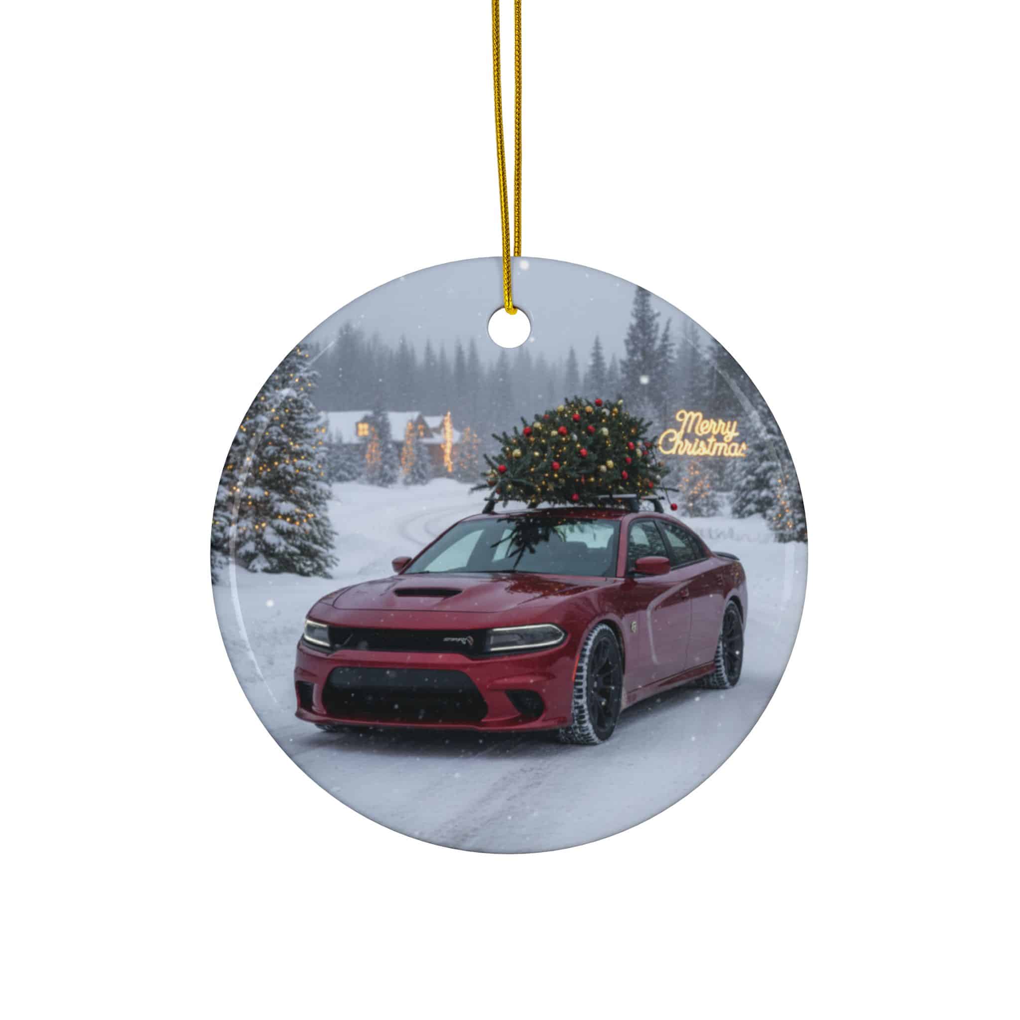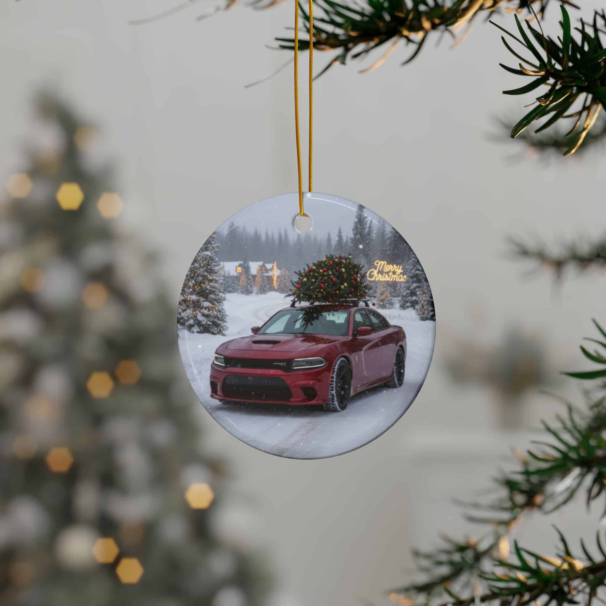 Add muscle to your holiday season with this Dodge Charger Hellcat Christmas Ornament, featuring the iconic red Hellcat carrying a Christmas tree through a snowy winter wonderland. The perfect blend of horsepower and holiday cheer, this ornament is made for true gearheads who want their love for speed to shine on the Christmas tree.