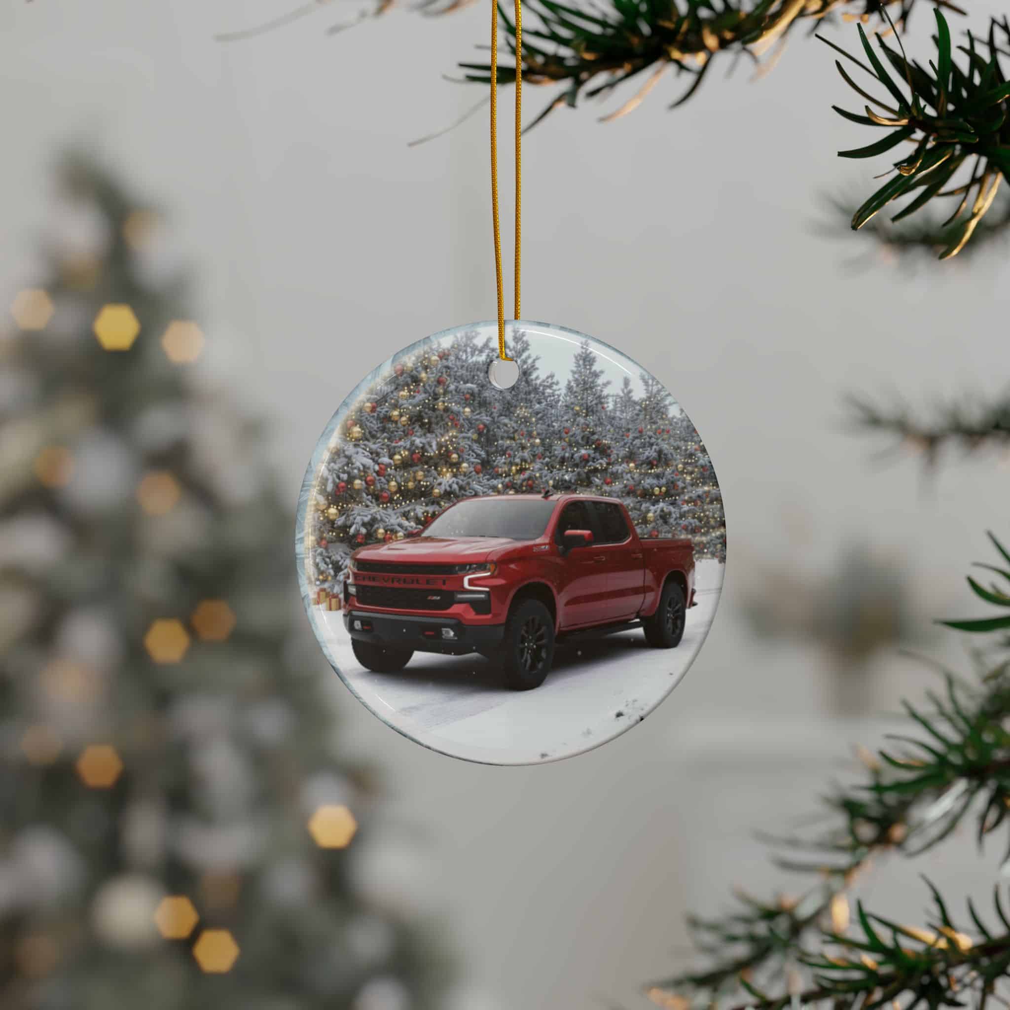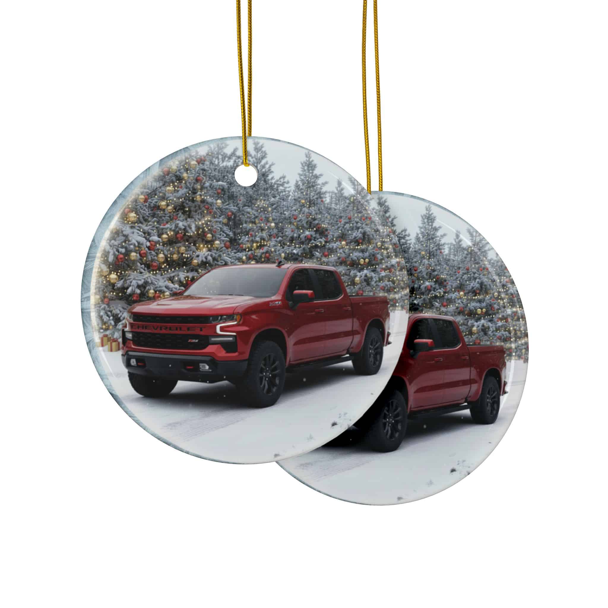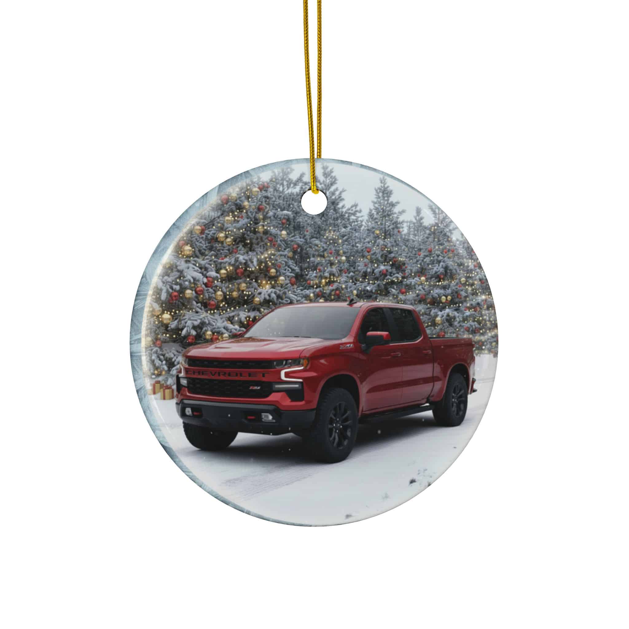 Bring rugged off-road style to your holiday décor with this Chevy ZR2 Ceramic Christmas Ornament. Featuring Chevrolet’s high-performance off-road truck set in a snowy Christmas scene, this ornament captures the perfect mix of toughness and holiday cheer — a must-have for any Chevy or truck enthusiast.
