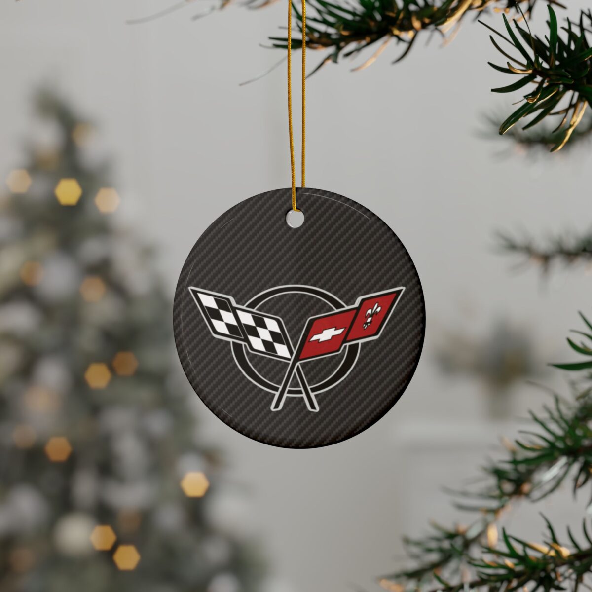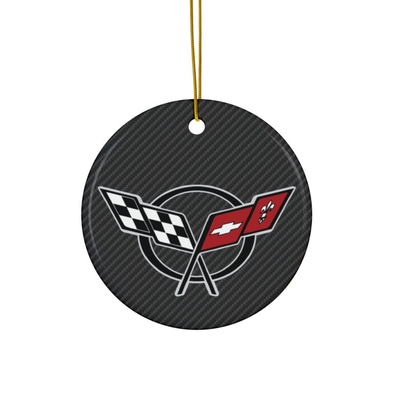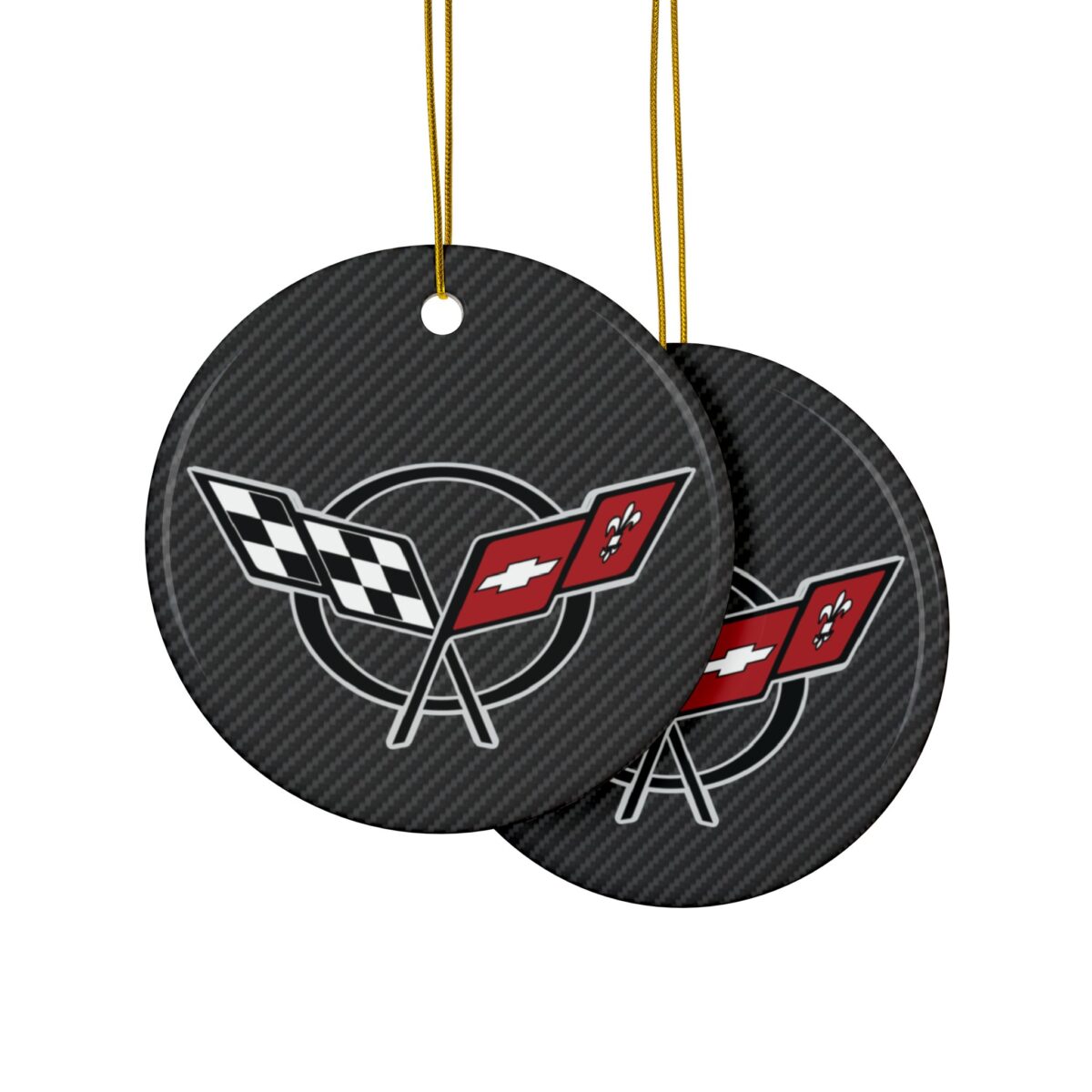 Celebrate the holidays with classic Corvette style. This Corvette C5 Carbon Fiber Ceramic Christmas Ornament features a sleek faux–carbon fiber background paired with the iconic C5 emblem, giving it a bold, high-performance look that stands out on any Christmas tree. Glossy, sharp, and unmistakably Corvette, it brings the spirit of American sports car heritage into your holiday décor.