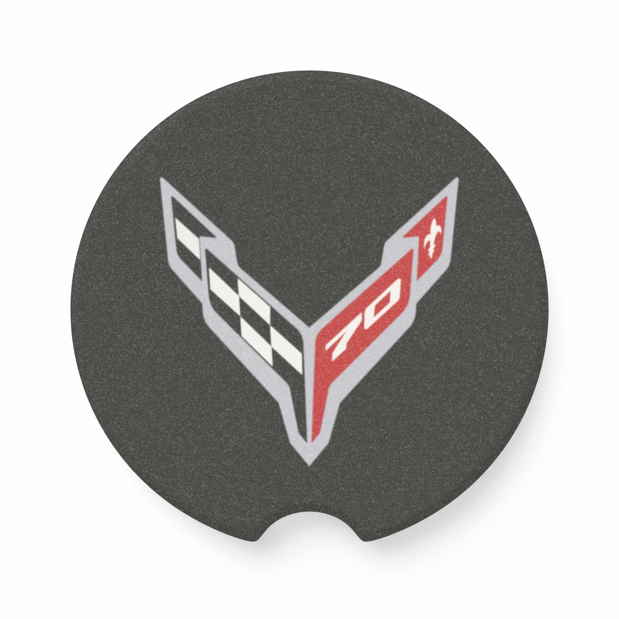 Celebrate 70 years of Corvette heritage with this premium C8 70th Anniversary Soapstone Car Coaster. Featuring the 70th Anniversary emblem over a sleek carbon fiber background, this accessory adds a collectible touch of Corvette history while keeping your cup holders spotless.