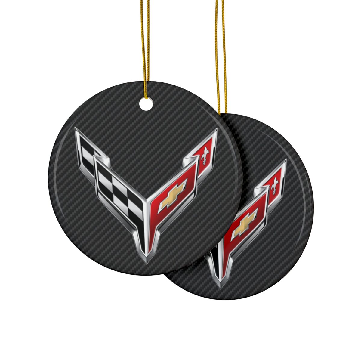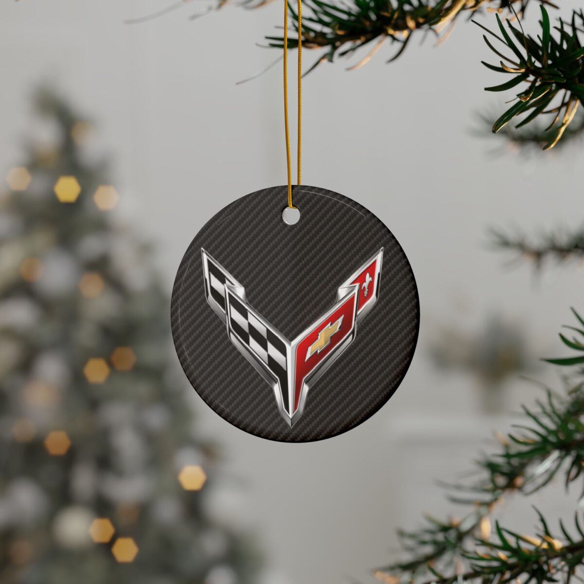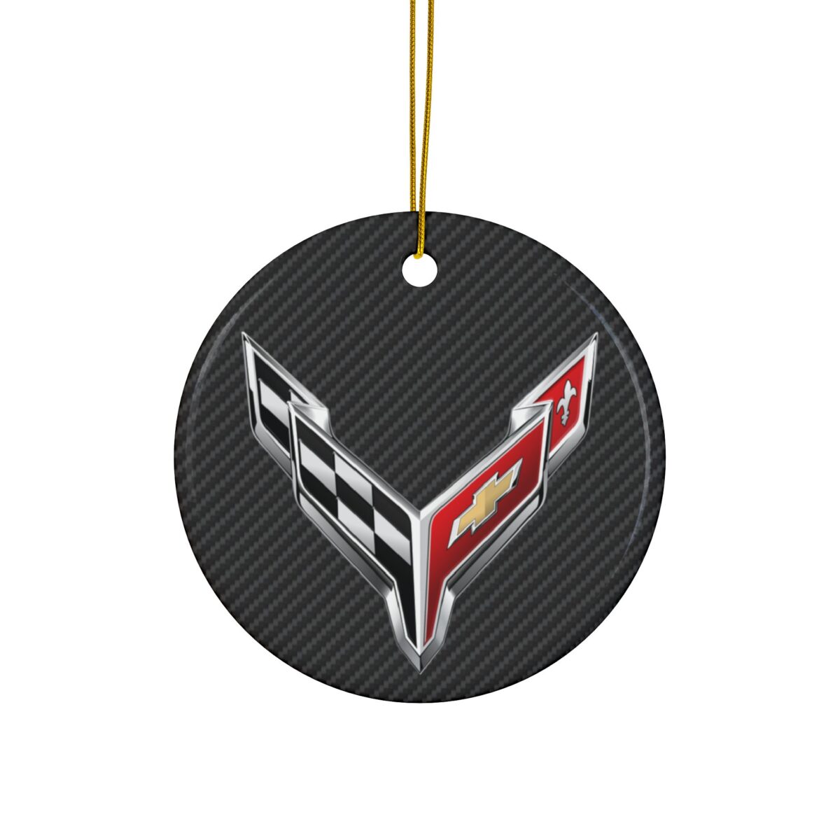 Crafted from premium ceramic, it features a glossy finish with double-sided, full-color printing for a bold, high-definition look. The included gold hanging cord makes it ready to display right out of the box — perfect for Christmas trees, office décor, or collector displays. This C8 Corvette carbon fiber ornament makes the ultimate gift for any car lover or Corvette owner who appreciates style and performance year-round.