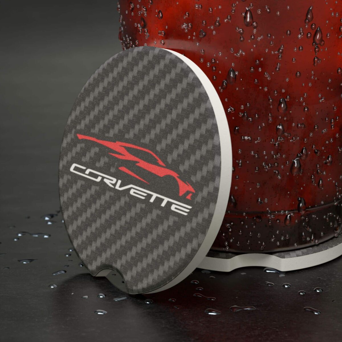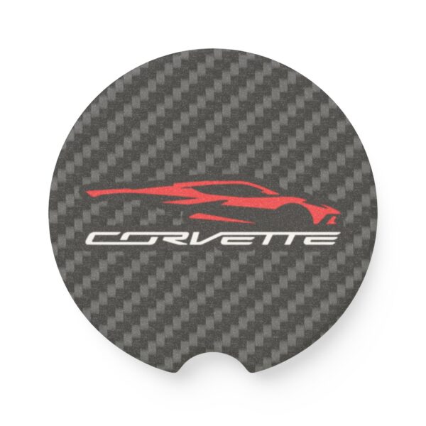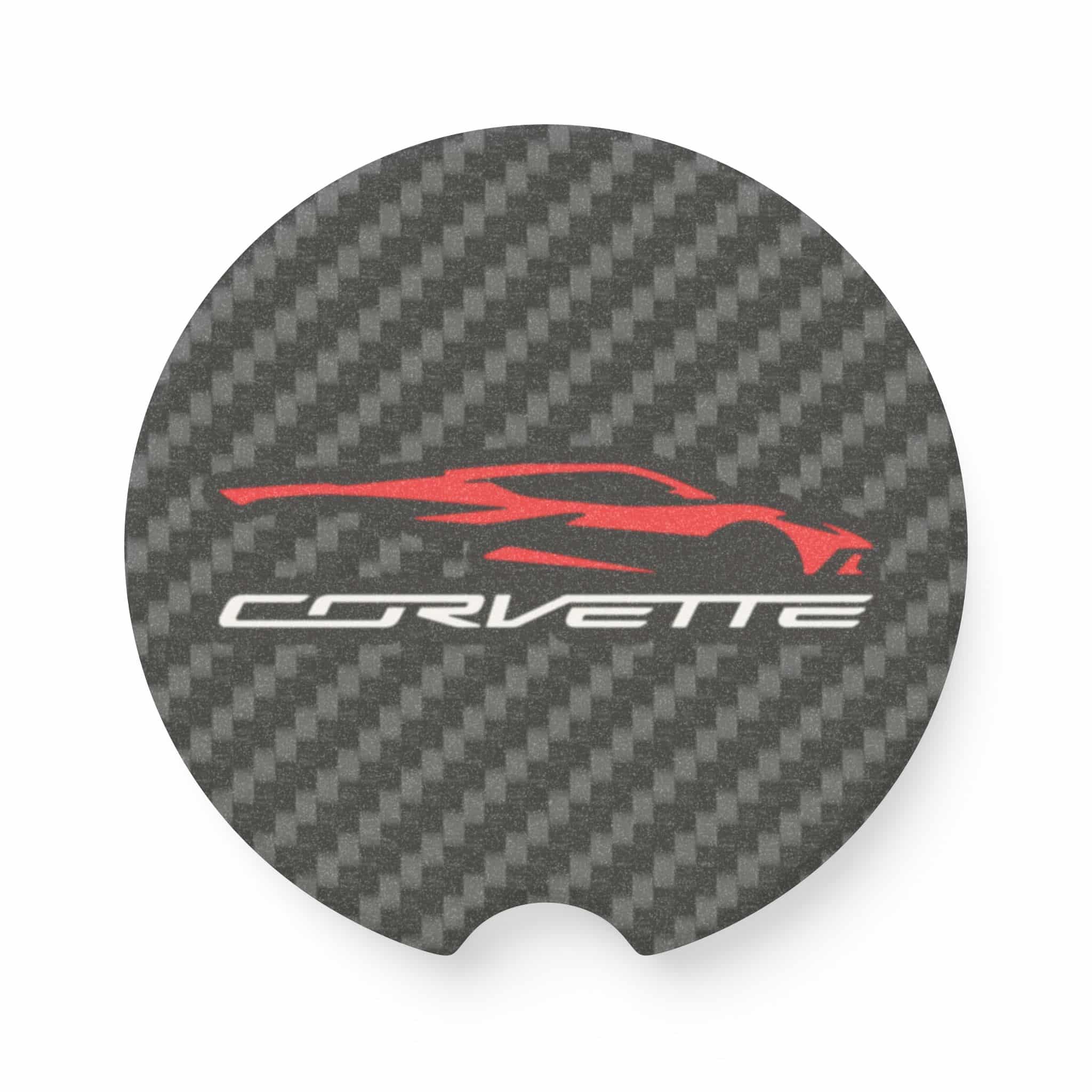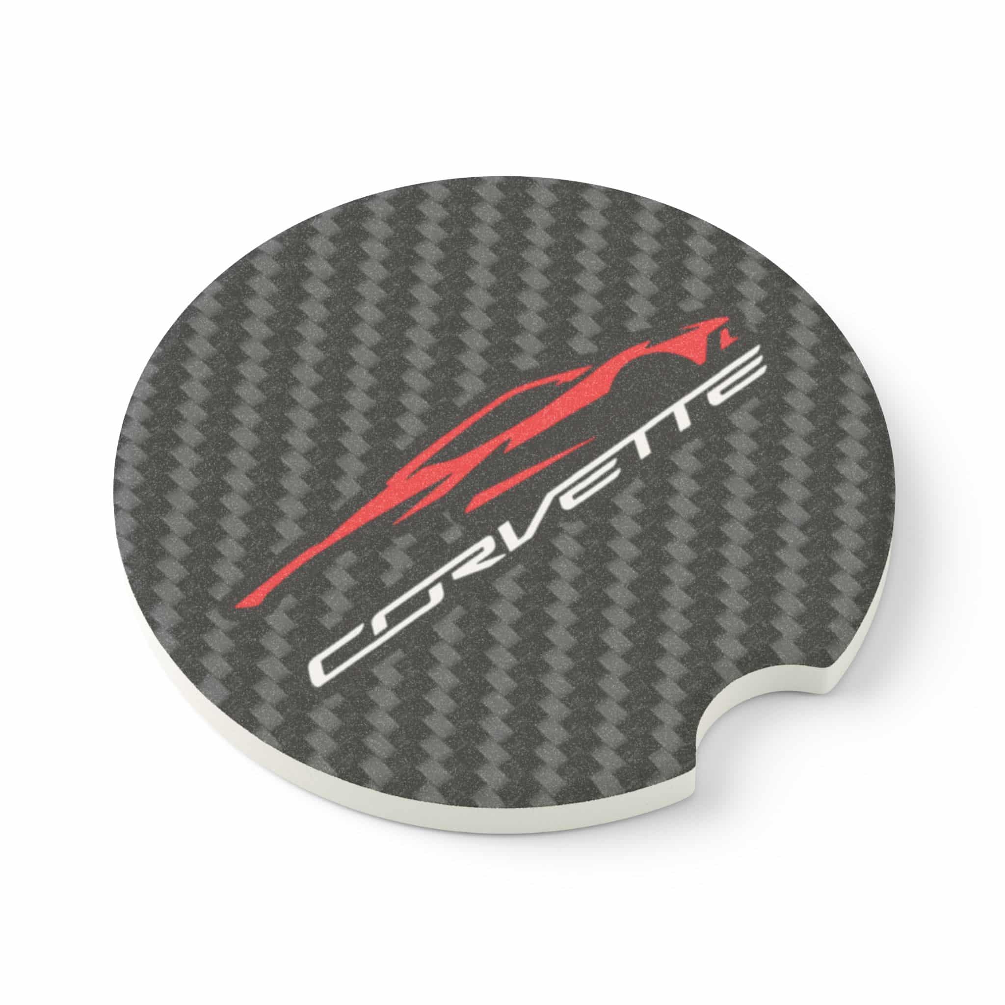 Keep your cup holders clean while showing off your Corvette C8 pride with this Soapstone Car Coaster. Featuring the sleek C8 silhouette graphic over a bold carbon fiber background, this accessory blends function with supercar style—perfect for Corvette enthusiasts.