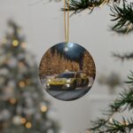 Crafted from premium ceramic, this round ornament features a double-sided, full-color print with crisp detail and a glossy finish that shines beautifully under your Christmas lights. It includes a gold hanging cord for easy display on your Christmas tree, in your garage, or anywhere you want to show your Corvette pride.