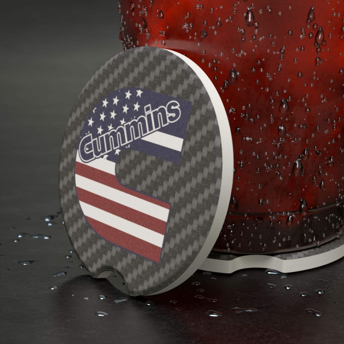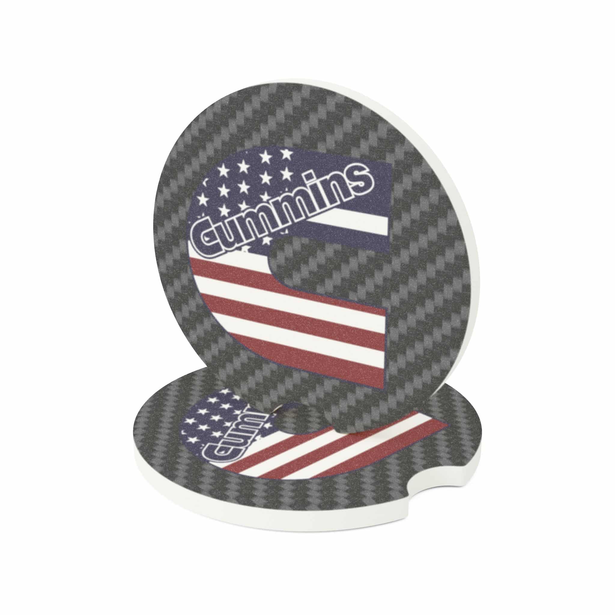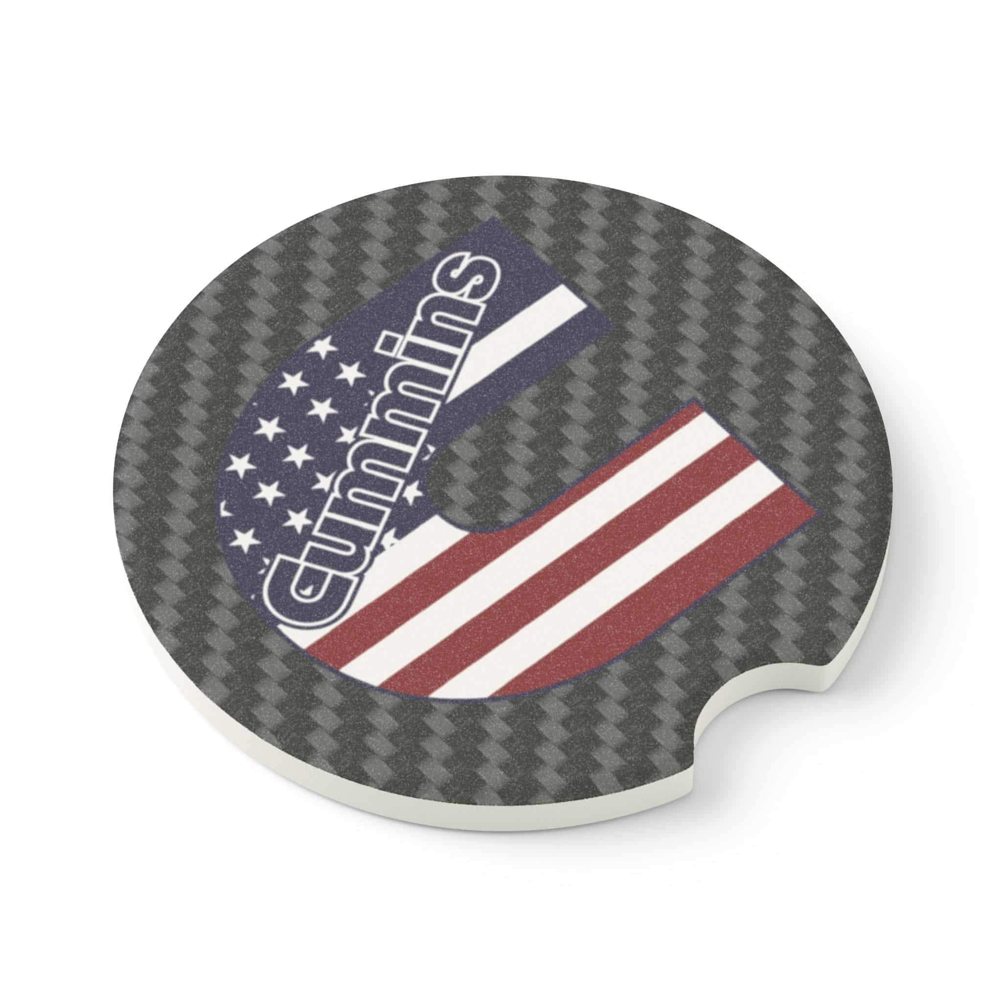 Show off your Cummins diesel pride and American spirit with this premium Soapstone Car Coaster. Featuring the bold Cummins logo paired with an American flag design over a sleek carbon fiber background, this accessory keeps your cup holders clean while making a patriotic statement.