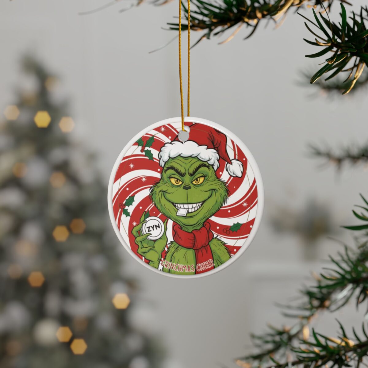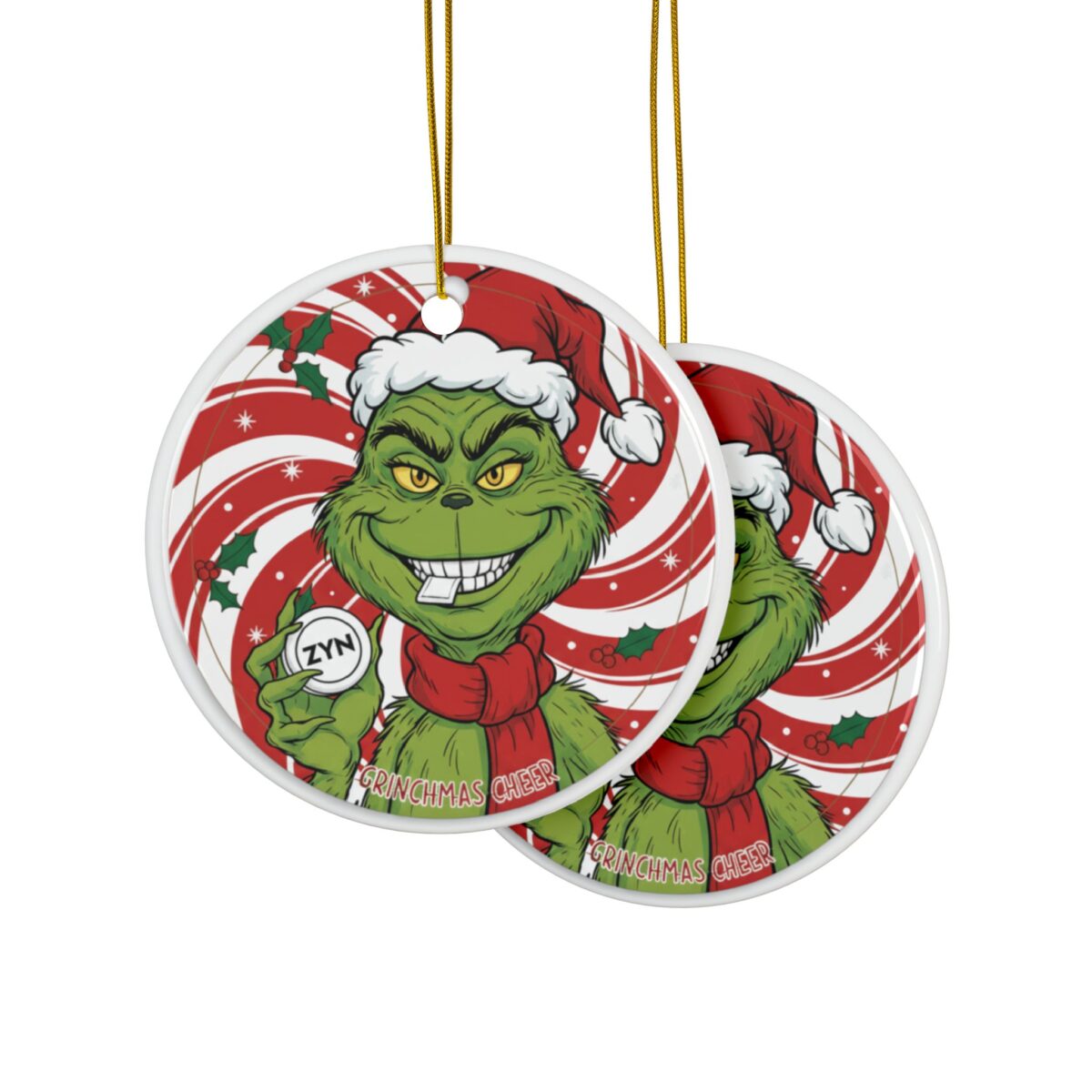 Made from premium ceramic, this ornament features a glossy finish and a double-sided full-color print that looks great from every angle. It comes with a gold hanging cord for easy display and is durable enough to enjoy year after year. Whether you’re gifting it to a friend or hanging it on your own tree, this Grinch ZYN ornament brings humor and personality to any Christmas setup.