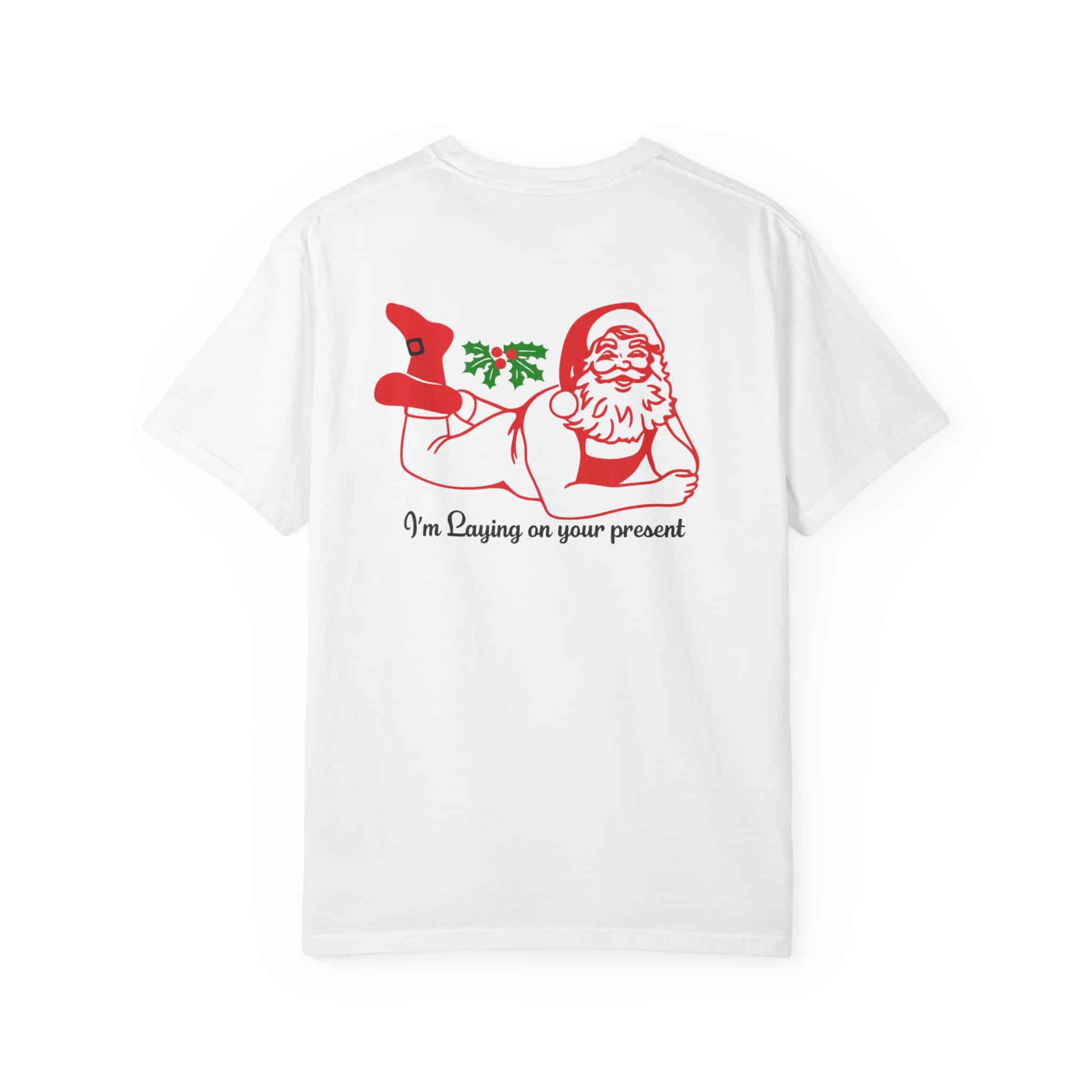 Comfort Colors “Laying on Your Present” Santa Tee – Cozy + Cheeky Holiday Shirt