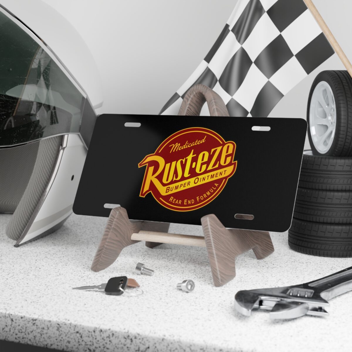 Add a burst of animated nostalgia to your space with this Rusteze Bumper Ointment License Plate! Inspired by the iconic sponsor from the Cars universe, this plate brings that quirky, feel-good Radiator Springs energy to any garage, kids’ room, man cave, or display wall. Whether you’re a Lightning McQueen fan, a collector of Pixar-themed décor, or just love the playful charm of Rusteze’s classic red-and-yellow branding, this plate delivers instant character and movie-magic personality.