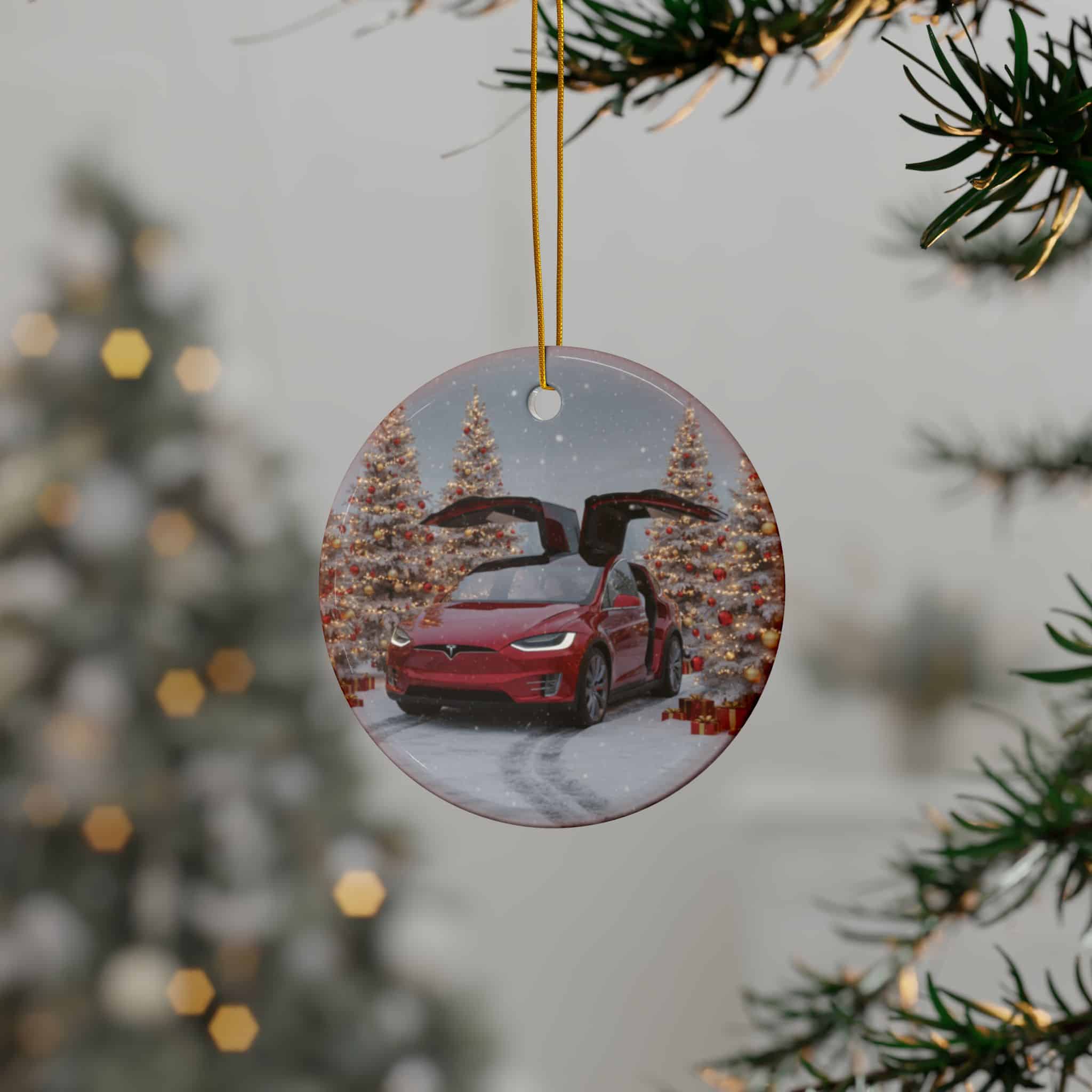 Crafted from high-quality ceramic, this round ornament features a double-sided, full-color print with crisp detail and a glossy finish that gleams under your Christmas lights. The included gold hanging cord makes it easy to display on your tree, in your garage, or anywhere you want to show your Tesla pride.